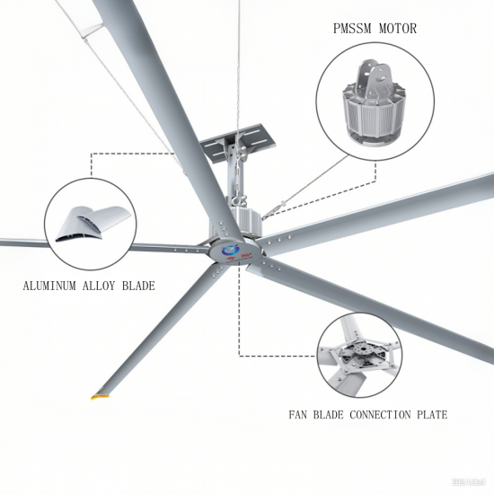 その サーボ ダイレクトドライブhvls せい lingファン 空力原理と高度な技術で作られた合理化されたファンブレードを適用しています。環境にやさしいグリーンです。わずか0.66 / 0.88 / 1.3kw以下の電力で、大量の空気を駆動し、大面積の自然な微風システムを生成し、換気と冷却の二重の機能を果たします。
